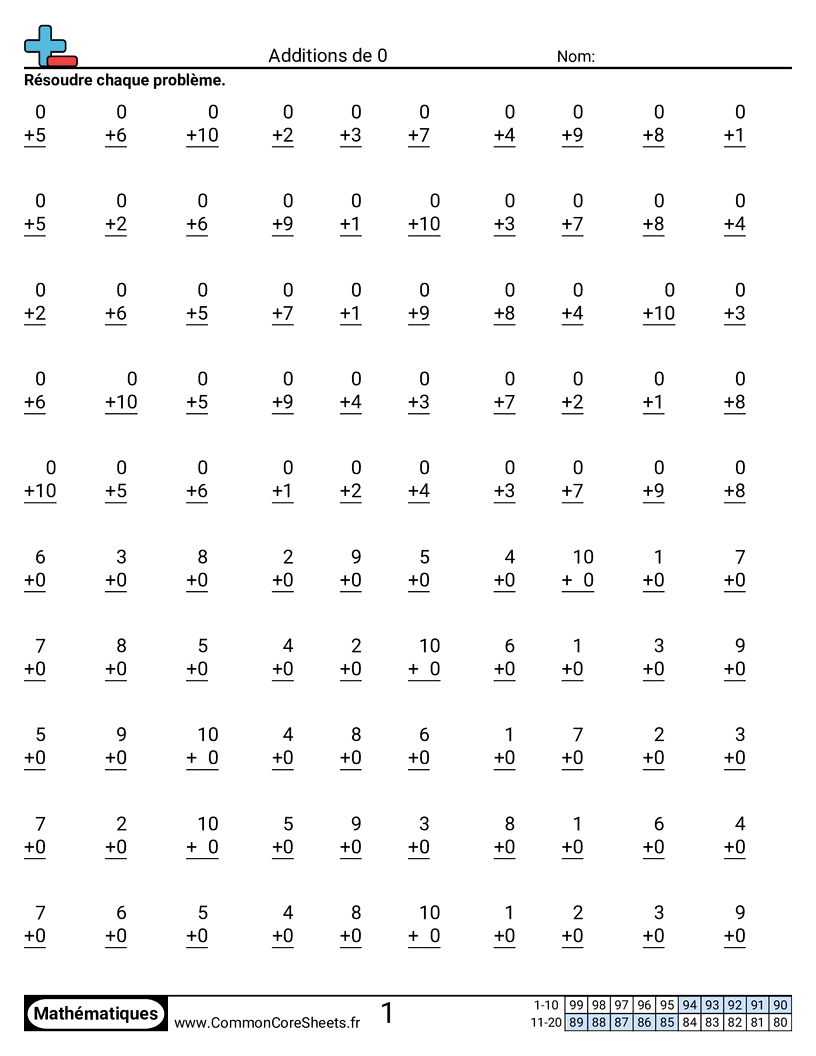 Fiches gratuites de math sur Additions de 0. Chaque fiche contient 100 exercices avec corrigé et convient aux enseignants et à l'enseignement à domicile. Vous pouvez télécharger le PDF, créer des cartes mémoire ou l'utiliser pour l'apprentissage en ligne.