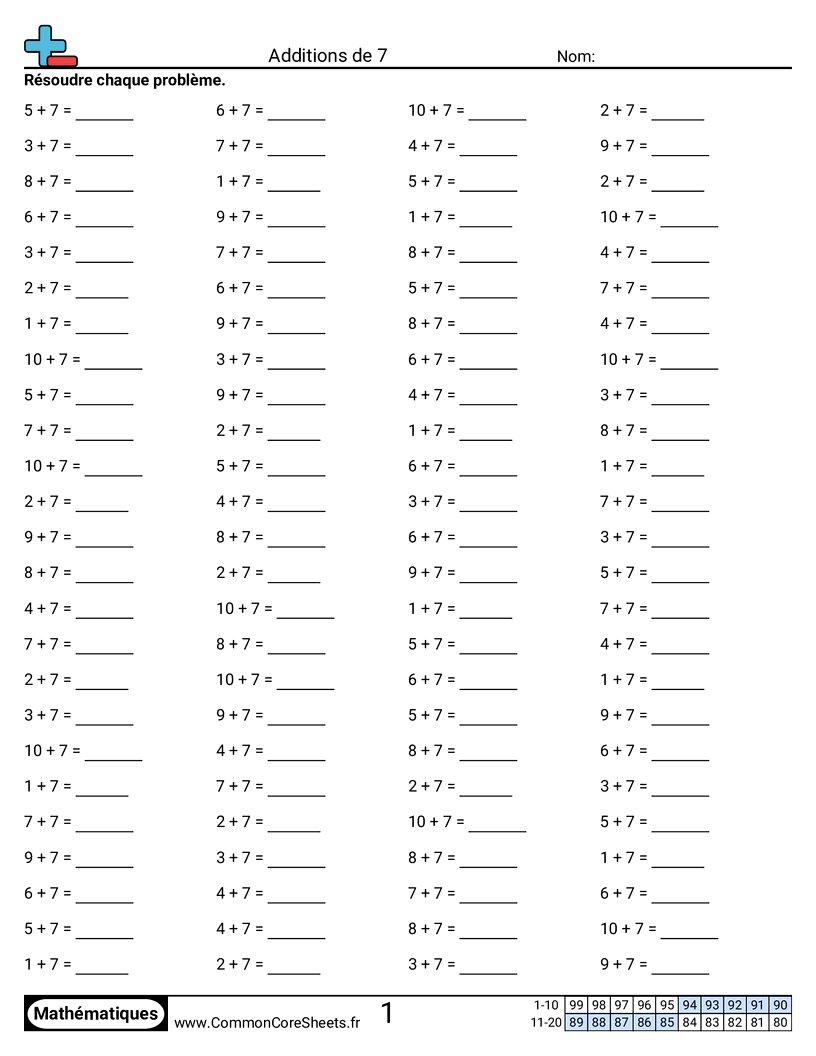 Fiches gratuites de math sur Additions de 7. Chaque fiche contient 100 exercices avec corrigé et convient aux enseignants et à l'enseignement à domicile. Vous pouvez télécharger le PDF, créer des cartes mémoire ou l'utiliser pour l'apprentissage en ligne.