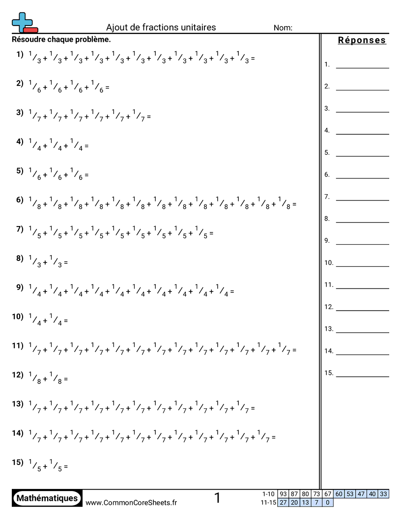 Fiches gratuites de math sur Ajout de fractions unitaires. Chaque fiche contient 15 exercices avec corrigé et convient aux enseignants et à l'enseignement à domicile. Vous pouvez télécharger le PDF, créer des cartes mémoire ou l'utiliser pour l'apprentissage en ligne.