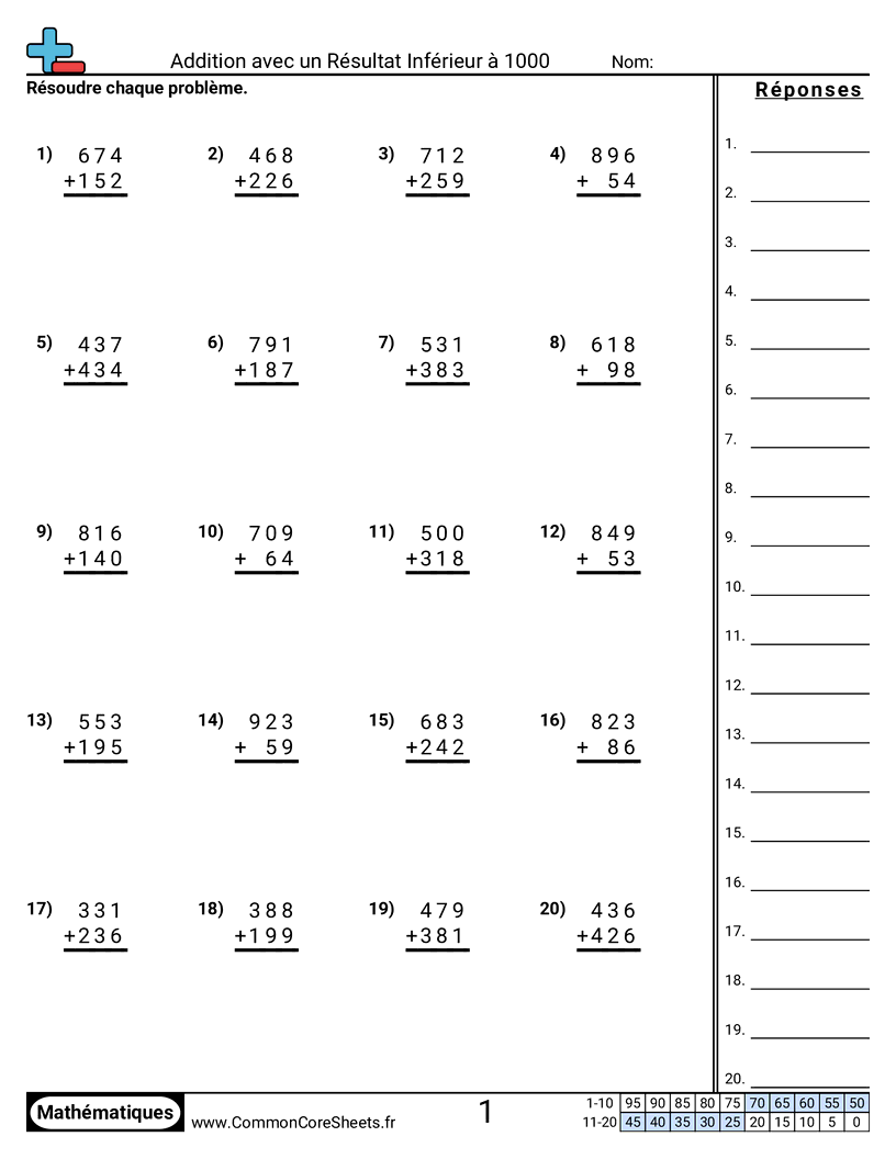 Chaque fiche d'exercices comporte 20 problèmes, faites des additions où le résultat est inférieur à 1000
