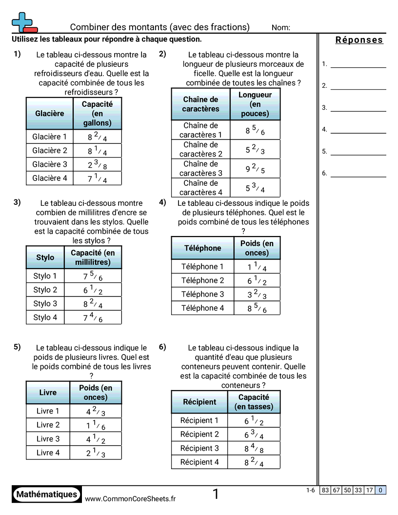 Fiches gratuites de math pour CM2 (5nf1) sur Combiner des montants (avec des fractions) . Chaque fiche contient 6 exercices avec corrigé et convient aux enseignants et à l'enseignement à domicile. Vous pouvez télécharger le PDF, créer des cartes mémoire ou l'utiliser pour l'apprentissage en ligne.