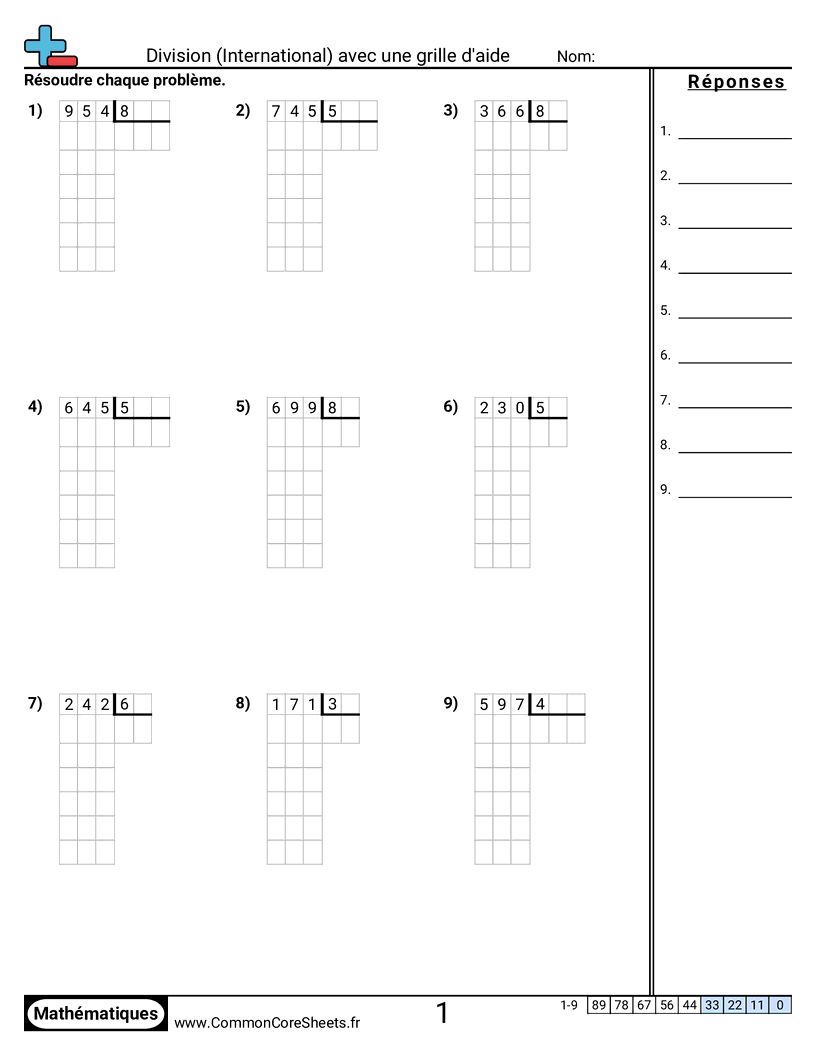 Fiches gratuites de math sur Division (International) avec une grille d'aide. Chaque fiche contient 9 exercices avec corrigé et convient aux enseignants et à l'enseignement à domicile. Vous pouvez télécharger le PDF, créer des cartes mémoire ou l'utiliser pour l'apprentissage en ligne.