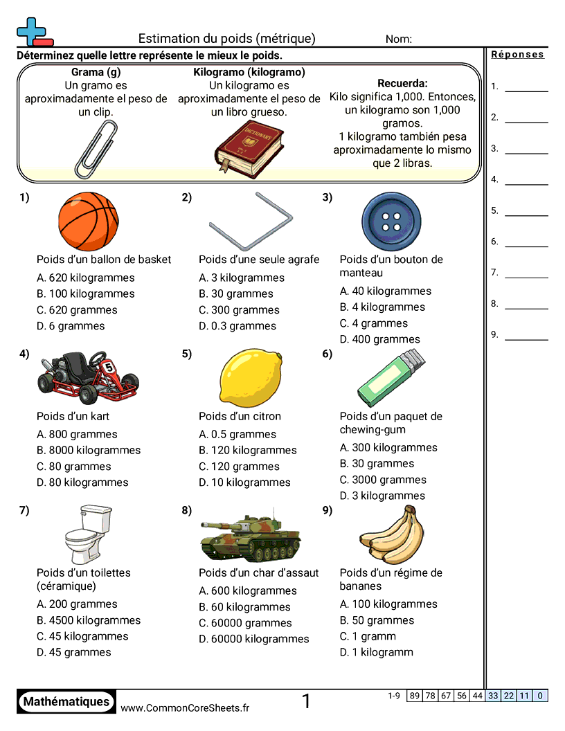 Fiches gratuites de math pour CE2 (3md2) sur Estimation du poids (métrique) . Chaque fiche contient 9 exercices avec corrigé et convient aux enseignants et à l'enseignement à domicile. Vous pouvez télécharger le PDF, créer des cartes mémoire ou l'utiliser pour l'apprentissage en ligne.