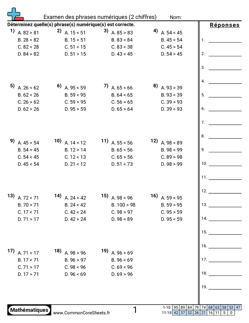 Fiches gratuites de math sur Examen des phrases numériques (2 chiffres) . Chaque fiche contient 19 exercices avec corrigé et convient aux enseignants et à l'enseignement à domicile. Vous pouvez télécharger le PDF, créer des cartes mémoire ou l'utiliser pour l'apprentissage en ligne.