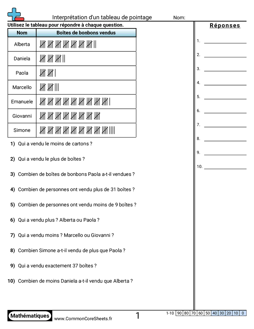 Fiches gratuites de math sur Interprétation d'un tableau de pointage. Chaque fiche contient 10 exercices avec corrigé et convient aux enseignants et à l'enseignement à domicile. Vous pouvez télécharger le PDF, créer des cartes mémoire ou l'utiliser pour l'apprentissage en ligne.