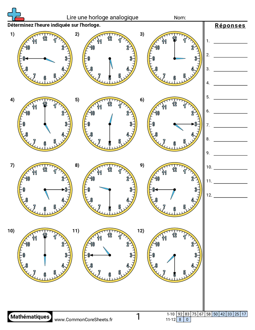 Fiches gratuites de math pour CE1 (2md7) sur Lire une horloge analogique. Chaque fiche contient 12 exercices avec corrigé et convient aux enseignants et à l'enseignement à domicile. Vous pouvez télécharger le PDF, créer des cartes mémoire ou l'utiliser pour l'apprentissage en ligne.
