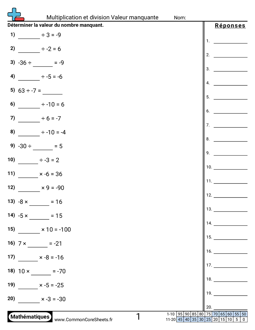 Fiches gratuites de math pour 5ème (7ns2b) sur Multiplication et division Valeur manquante. Chaque fiche contient 20 exercices avec corrigé et convient aux enseignants et à l'enseignement à domicile. Vous pouvez télécharger le PDF, créer des cartes mémoire ou l'utiliser pour l'apprentissage en ligne.