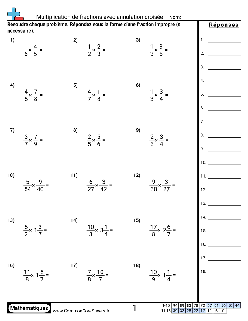 Fiches gratuites de math pour CM2 (5nf6) sur Multiplication de fractions avec annulation croisée. Chaque fiche contient 18 exercices avec corrigé et convient aux enseignants et à l'enseignement à domicile. Vous pouvez télécharger le PDF, créer des cartes mémoire ou l'utiliser pour l'apprentissage en ligne.