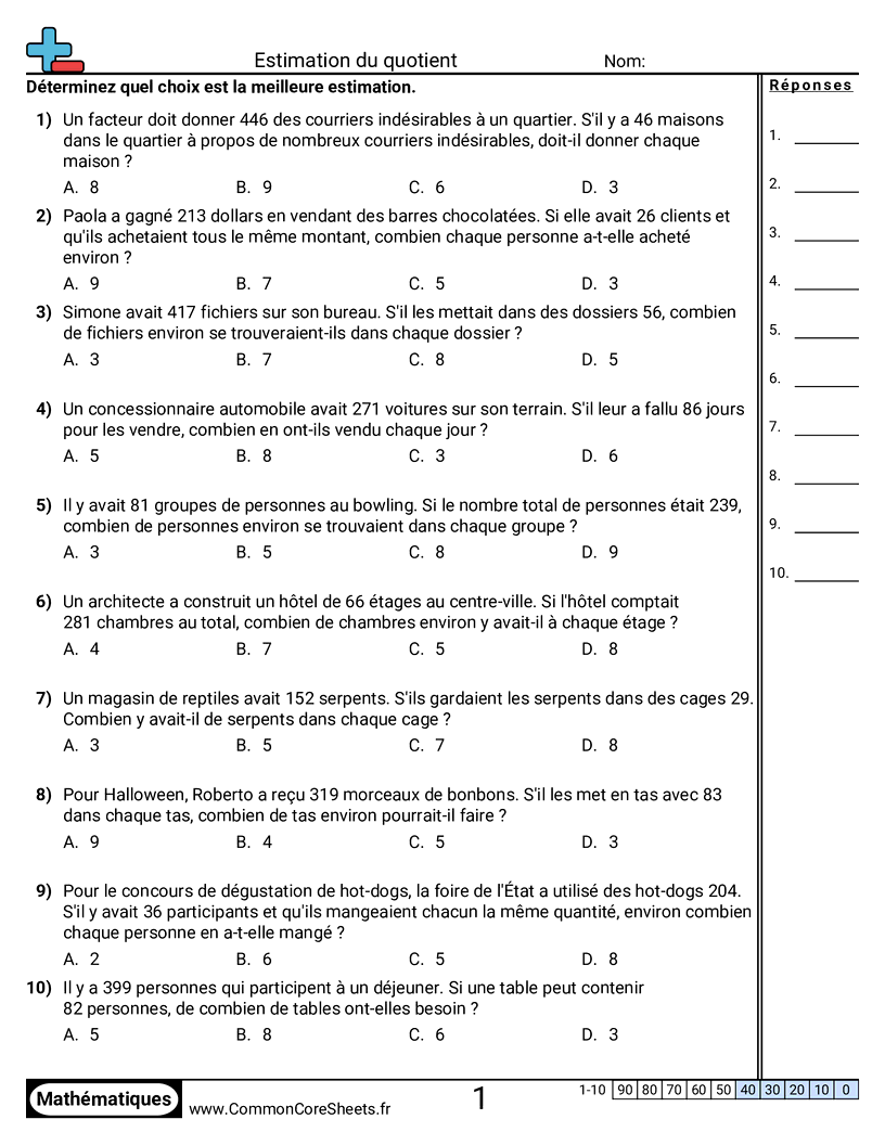 Fiches gratuites de math pour CM1 (4nbt6) sur Estimation du quotient . Chaque fiche contient 10 exercices avec corrigé et convient aux enseignants et à l'enseignement à domicile. Vous pouvez télécharger le PDF, créer des cartes mémoire ou l'utiliser pour l'apprentissage en ligne.