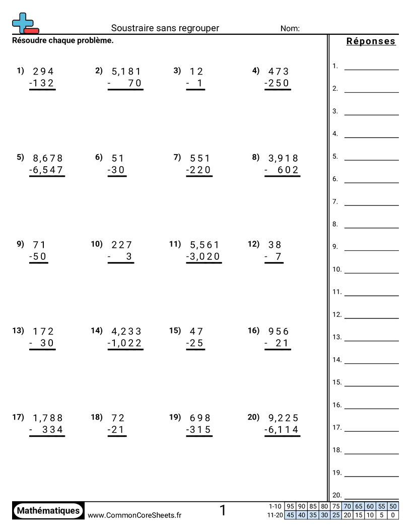 Fiches gratuites de math sur Soustraire sans regrouper. Chaque fiche contient 20 exercices avec corrigé et convient aux enseignants et à l'enseignement à domicile. Vous pouvez télécharger le PDF, créer des cartes mémoire ou l'utiliser pour l'apprentissage en ligne.