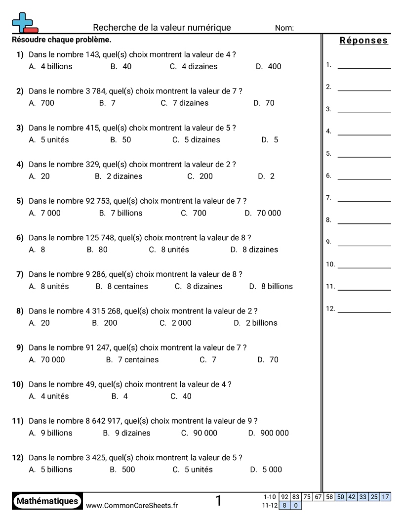 Fiches gratuites de math sur Recherche de la valeur numérique. Chaque fiche contient 12 exercices avec corrigé et convient aux enseignants et à l'enseignement à domicile. Vous pouvez télécharger le PDF, créer des cartes mémoire ou l'utiliser pour l'apprentissage en ligne.