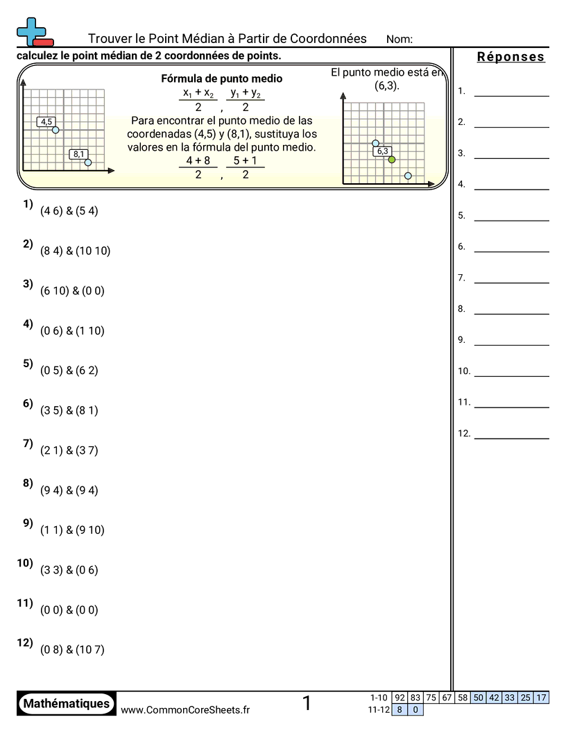 Fiches gratuites de math sur Trouver le Point Médian à Partir de Coordonnées. Chaque fiche contient 12 exercices avec corrigé et convient aux enseignants et à l'enseignement à domicile. Vous pouvez télécharger le PDF, créer des cartes mémoire ou l'utiliser pour l'apprentissage en ligne.